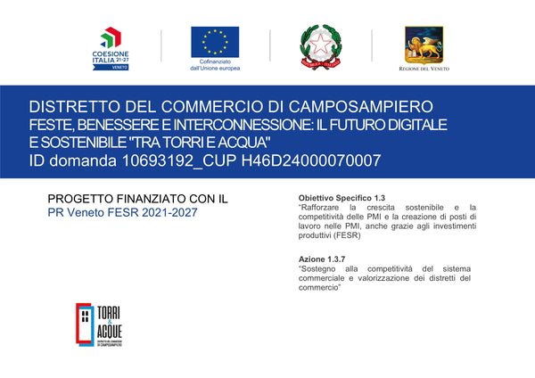La ditta 8.2 STYLE LAB ha partecipato al progetto finanziato dalla Regione Veneto a valere sul bando DGR n. 956 del 31 luglio 2023 per il Distretto del Commercio di Camposampiero, aderendo alle iniziative di riqualificazione delle strutture commerciali e valorizzazione del territorio attraverso iniziative di promozione e animazione svolte nel corso degli anni 2024 e 2025